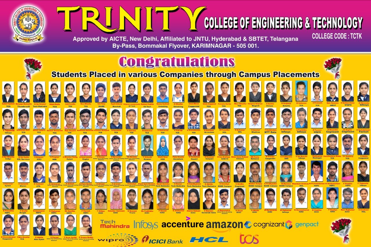 Trinity College of Engineering & Technology is committed to shaping industry-ready professionals through structured training, soft-skills enhancement, internships, and campus placements, ensuring students gain the confidence and competence to meet evolving industry demands and succeed in their chosen career paths. Our Training & Placement Cell focuses on the holistic development of students by conducting regular aptitude training, technical skill development programs, communication and personality development sessions, resume building workshops, group discussions, and mock interviews. We maintain strong interaction with industries and invite reputed organizations for campus recruitment drives, enabling students to secure placements and internships in leading companies. With dedicated guidance, career counseling, and continuous support from faculty and placement coordinators, we strive to create multiple opportunities for every eligible student to build a successful professional future.